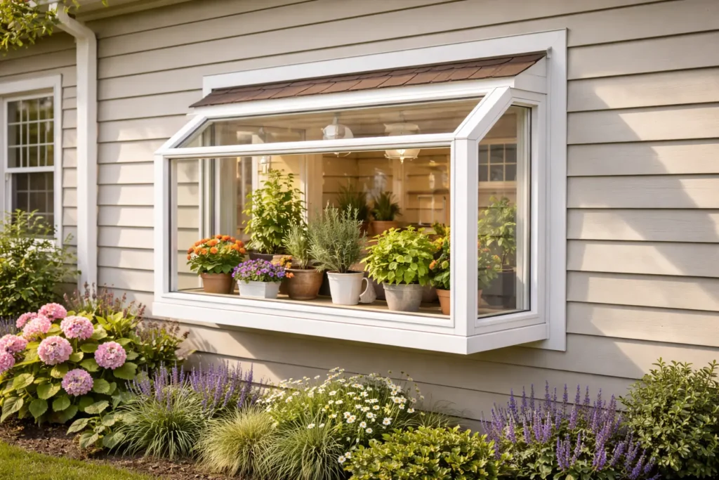 Garden windows let in a good amount of natural light with their wide glass area on the sides, top and bottom. These windows protrude from your home’s facade, so they will affect the siding. Better consult your window or siding contractor for a seamless installation.