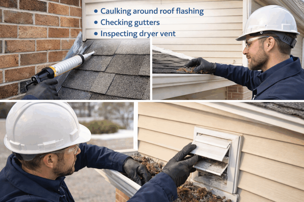 In addition to inspection, we handle small but important maintenance tasks such as caulking flashings, sealing exposed nails, identifying nail pops, and clearing minor debris from gutters. These preventative steps help your home withstand winter conditions and extend the life of your exterior systems.