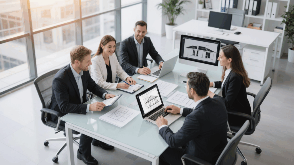 A confident project estimator standing outside a residential home in a suburban neighborhood, speaking with a homeowner