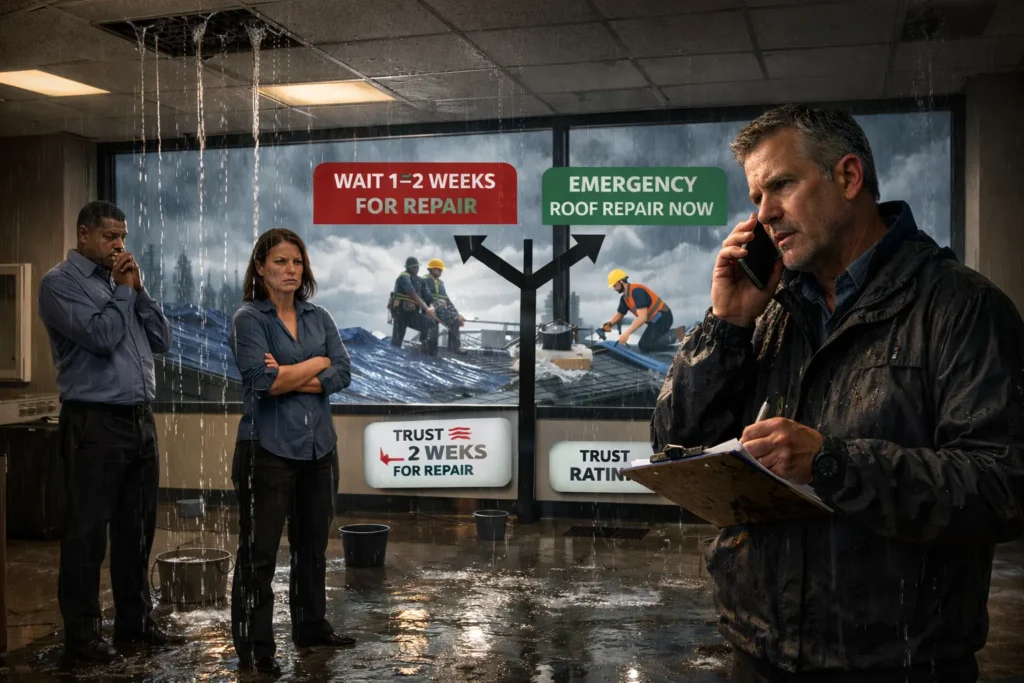 Severe roof leaks can require extensive roofing repair work. As given in our earlier example, the choice may come down to compensating your tenants from potential loss while you wait one or two weeks to schedule roof repairs or treating this as an emergency and halt operations as your trusted roofing contractors conduct emergency repairs. You have to consider that risking a day’s worth of revenue is worth more than losing your tenant’s confidence over the long term.
