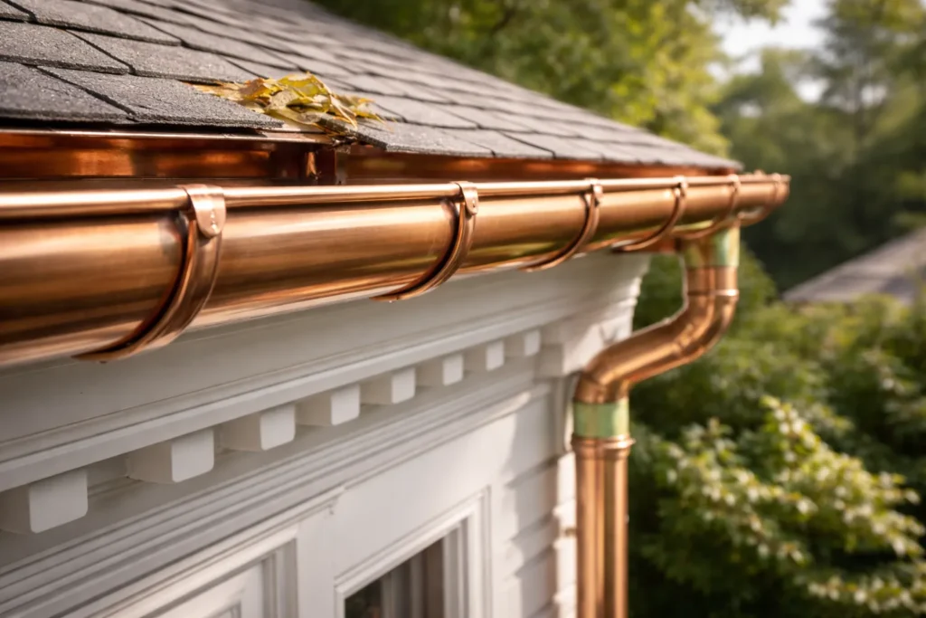 Traditional House Style — Traditional architectural styles, such as Colonial and Victorian, wouldn’t look right without half-round gutters. Copper half-round gutters create an authentic look, which is enhanced during its later years, when it starts developing green patina.