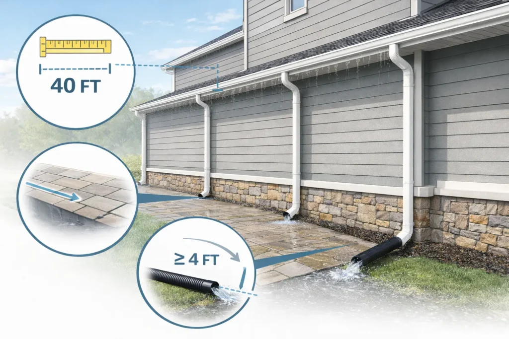 Roofing companies follow certain guidelines to ensure correct downspout placement. Below are some of the basic rules that should be observed when installing downspouts:
