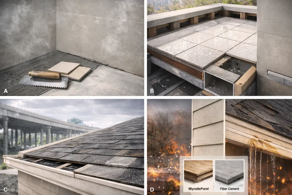 HardiePanel is compressed fiber cement (CFC) used for ceramic tile finishes on timber joists or lightweight steel. It’s also used as a substrate for tiled balconies and interior wet-area floors, including bathroom spaces. HardiePanel is a great alternative to plywood and particleboard due to its excellent resistance to weathering and moisture.