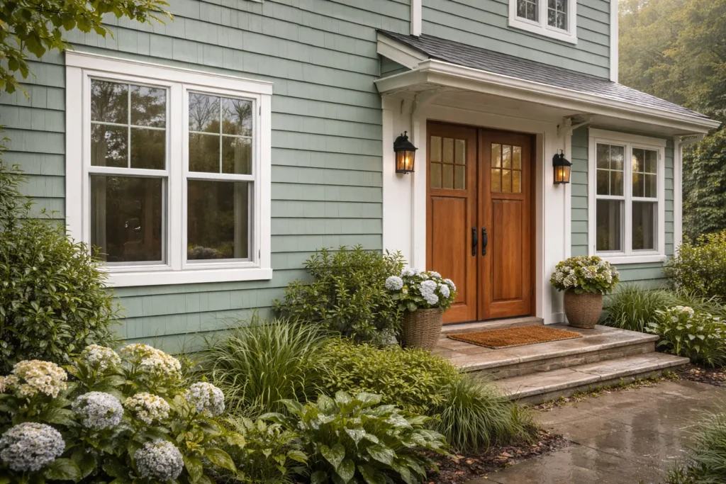 Seafoam green is a classic color for beachside homes, but it’s also an excellent color for siding set against a backdrop filled with lush green vegetation.