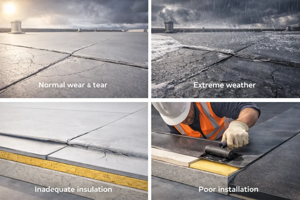 Inadequate insulation. Membrane seam failure can also be caused by mistakes made when installing the insulation. If the insulation isn’t attached to the roof properly, it will get bent under the membrane. As the material moves, it will pull on the seams and cause cracks and tears in different parts of the roof.