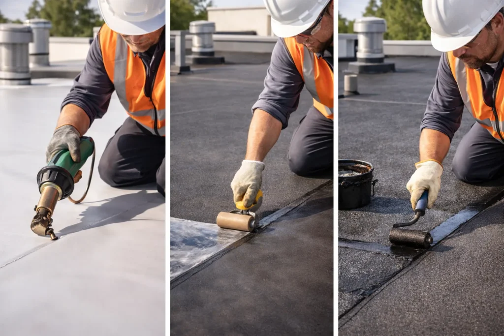 How you seal the seams on your commercial roof depends on its material. Hot air is used to melt thermoplastic membranes like polyvinyl chloride (PV) and seal them. Ethylene propylene diene monomer (EPDM) rubber is sealed using adhesives. Roofs made of modified bitumen are sealed with hot asphalt or cold glue.