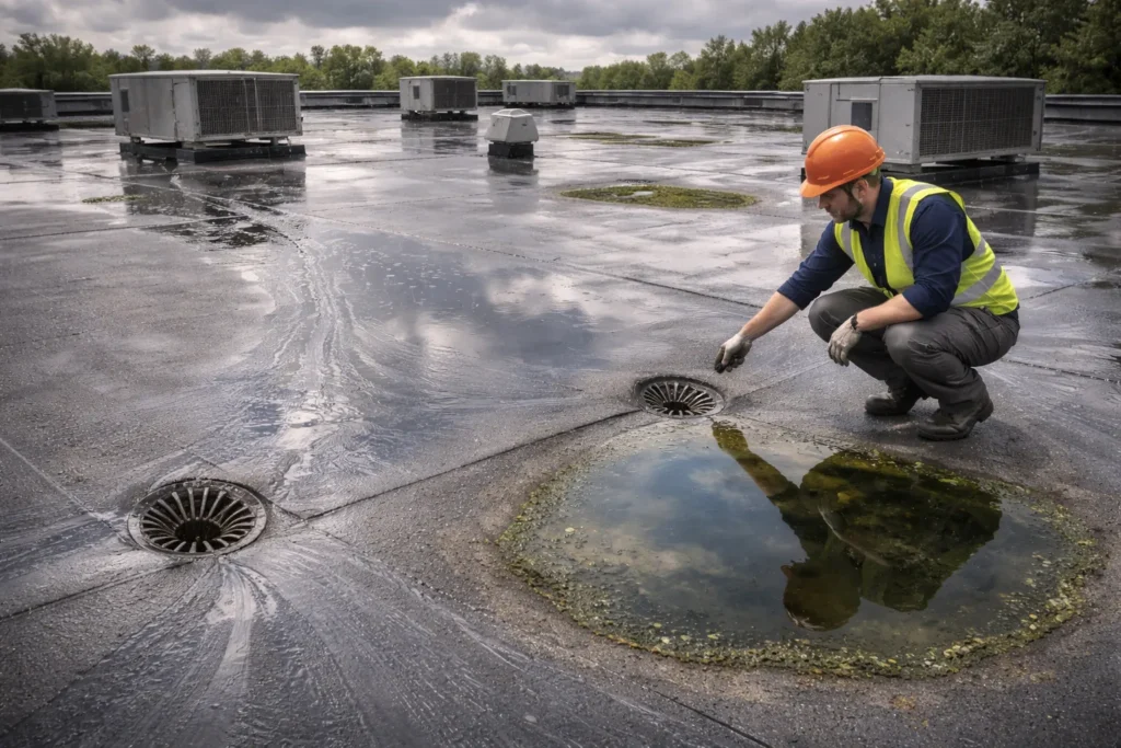 Finally, while most commercial properties have separate drains for water, some smaller buildings don’t. If you find your plumbing is suddenly clogged or slow to drain, there may be something wrong with your plumbing system, which could prevent water on your roof from draining properly.