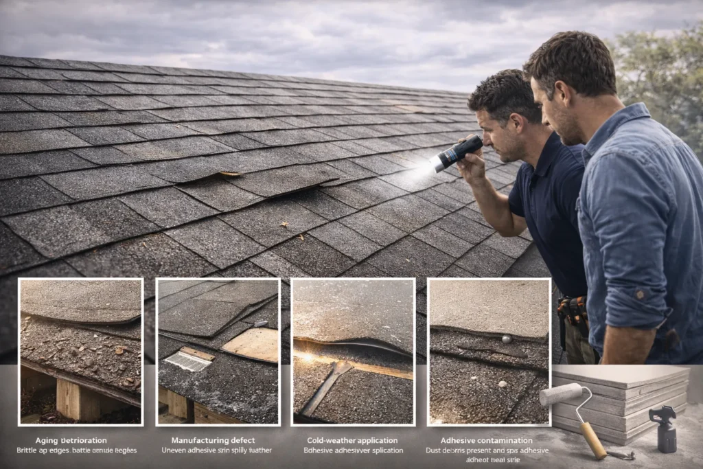 Keep in mind that wind is not the only thing that causes inadequate adhesion on shingles, and it can occur even without strong wind forces. Wind can lift and tear off shingles, but the wind does not always cause insufficient shingle adhesion.