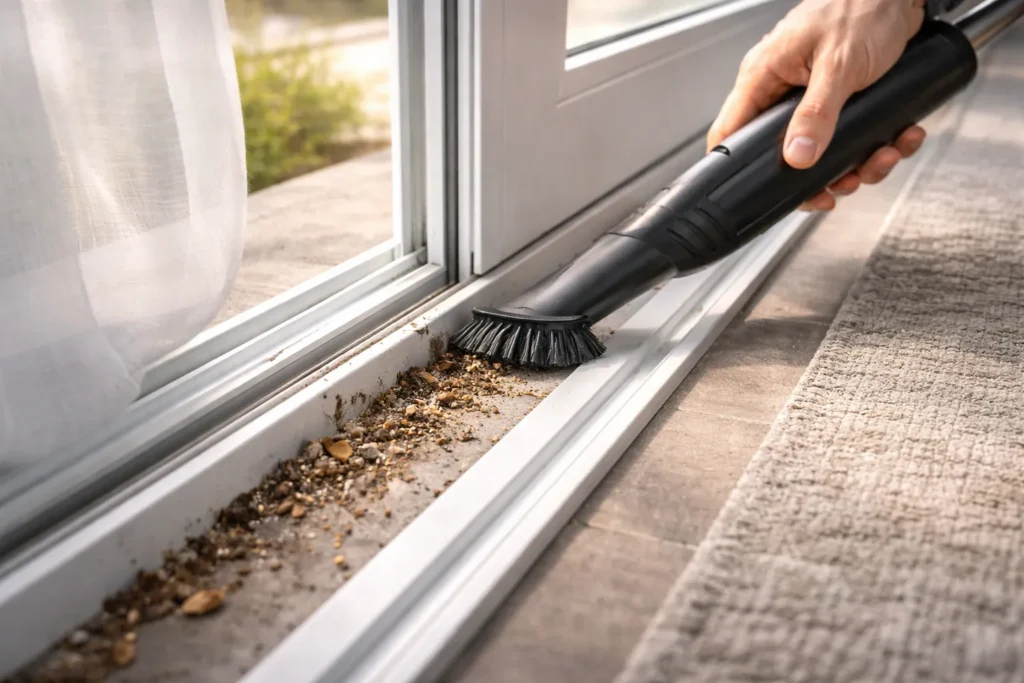 Dirt, dust, tiny stones and other debris can settle in the track of sliding doors. The debris will cause your door to not sit properly on the track. Air and wind can enter your home effortlessly when your sliding door is not in place. Vacuum or sweep the tracks regularly to remove debris and ensure the door closes properly.