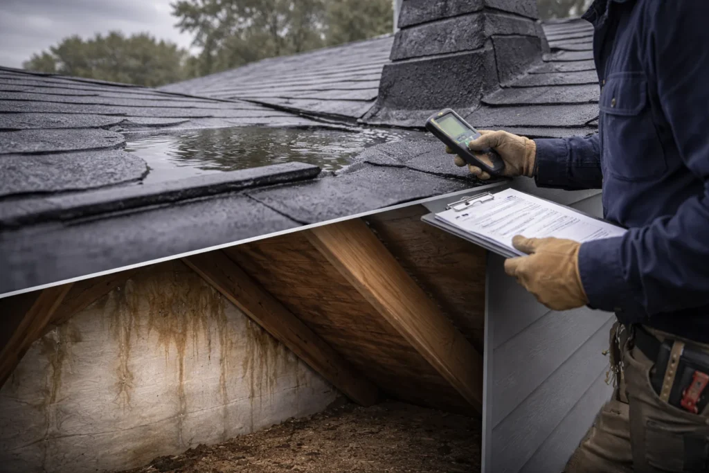 - Pooling Water – This is a common problem for low-sloped roofs. Water tends to pool on flat surfaces and can easily enter the underlayer through cracks and gaps at the seams.