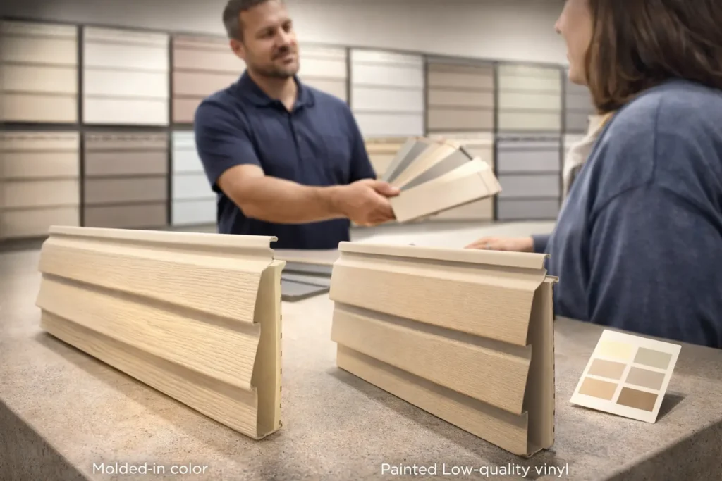A great aspect of vinyl siding is the molded-in colors – cut a piece in half, and the color appears throughout the material. It may appear faint or “washed out” as with low-quality vinyl siding. Paint can fix this, but you must be willing to scrape and repaint frequently. We suggest you look at samples at a local siding contractor’s showroom and choose the best siding material that fits your home’s aesthetic requirements.