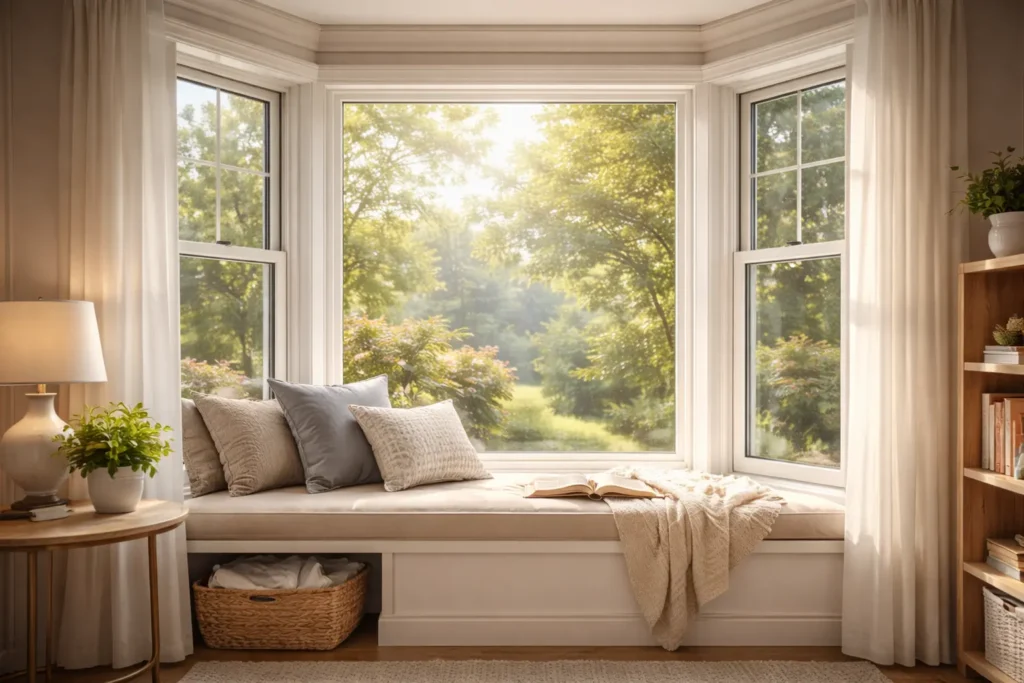 Bay windows are usually large picture windows flanked by two operable windows. They project outside and can catch light from different angles throughout the day. Bay windows feature four or more windows set on a curve. They can be fixed or operational and are great for daylighting.